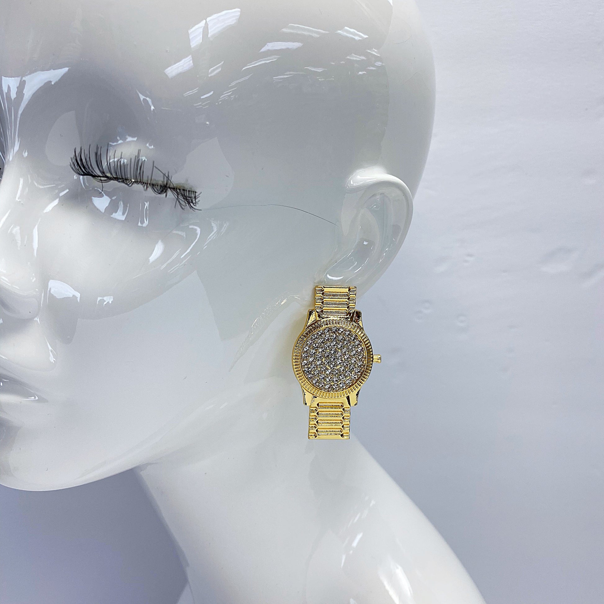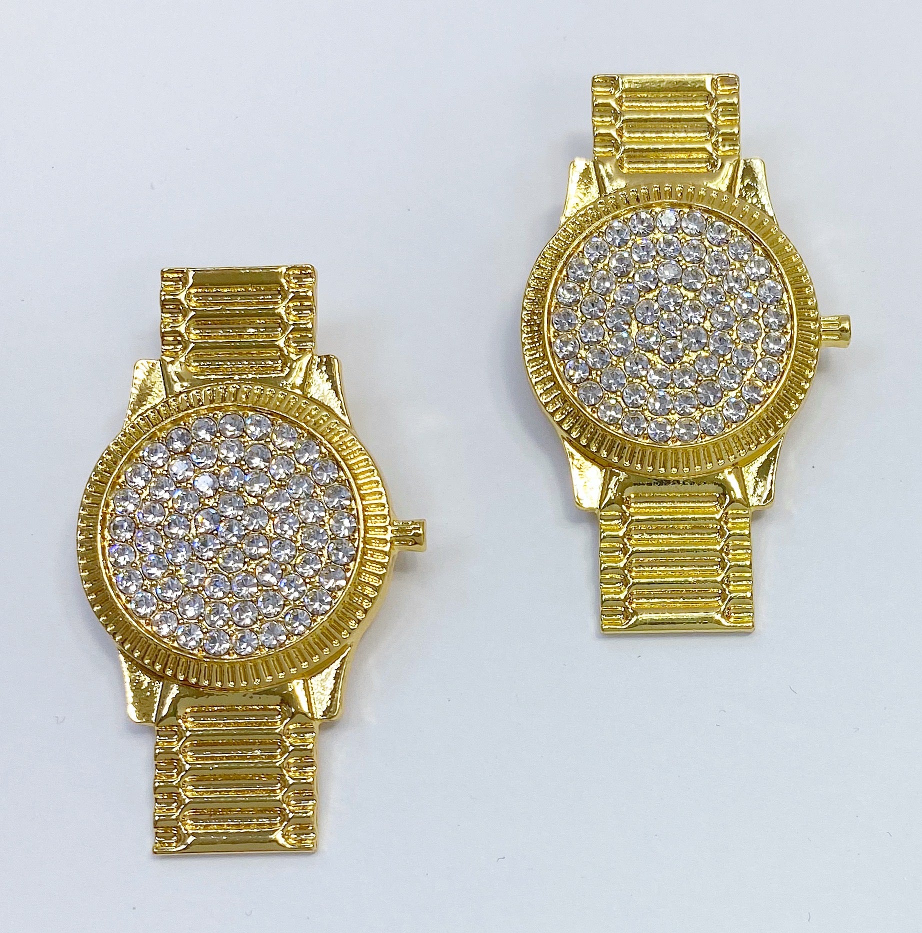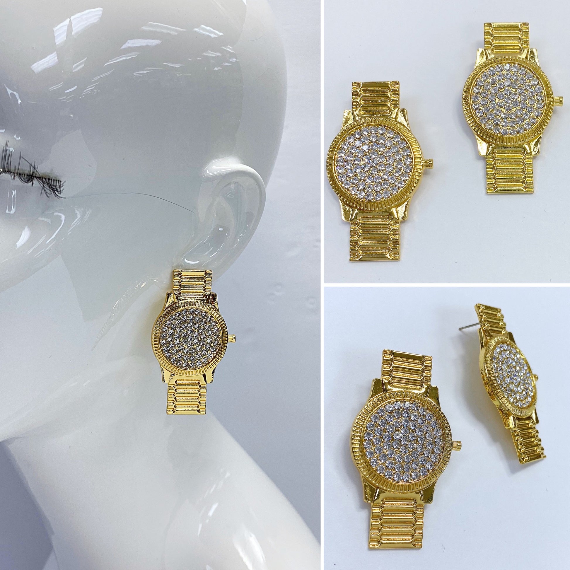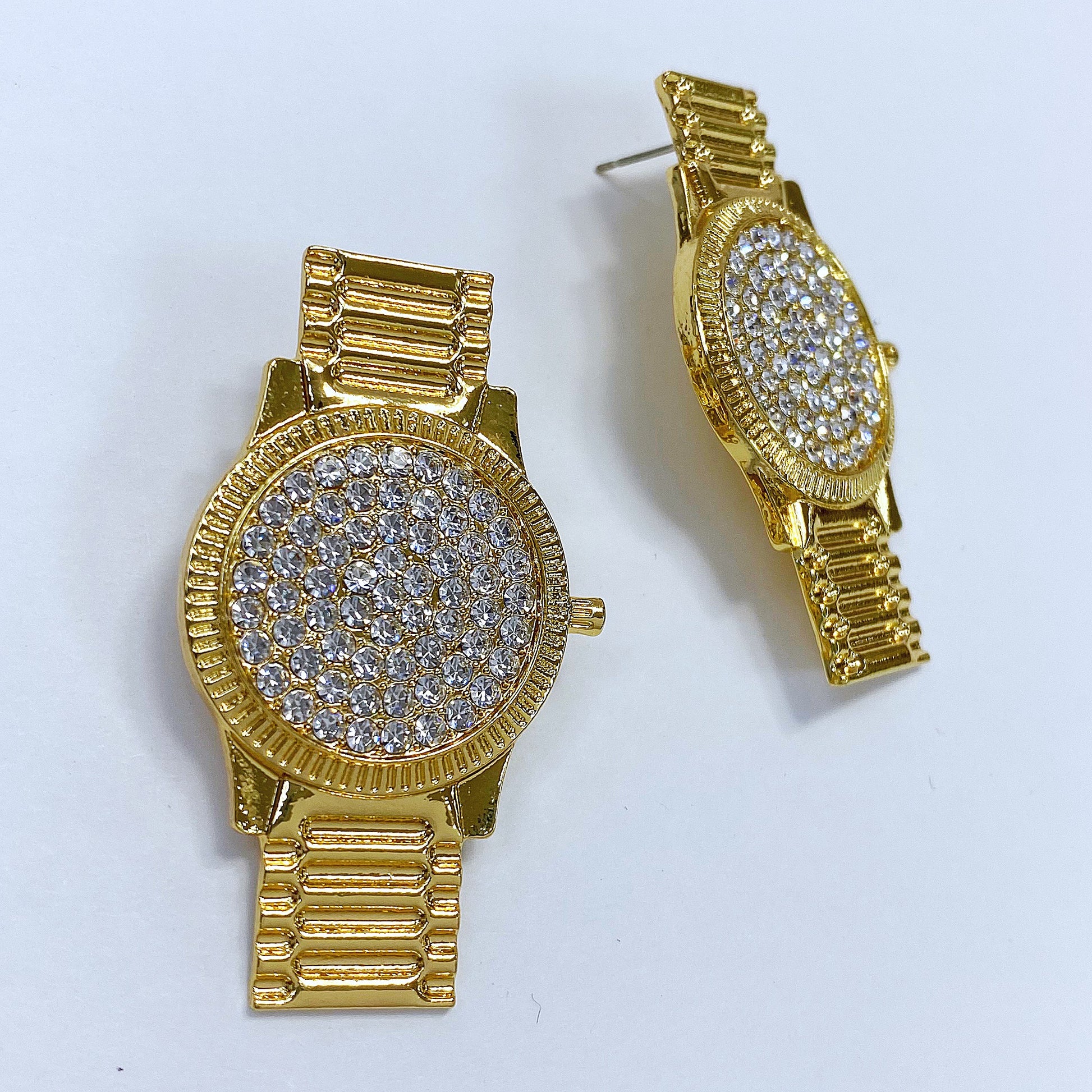 Gold Finish Clear Rhinestones Post Back Watch Shape Stud Earrings