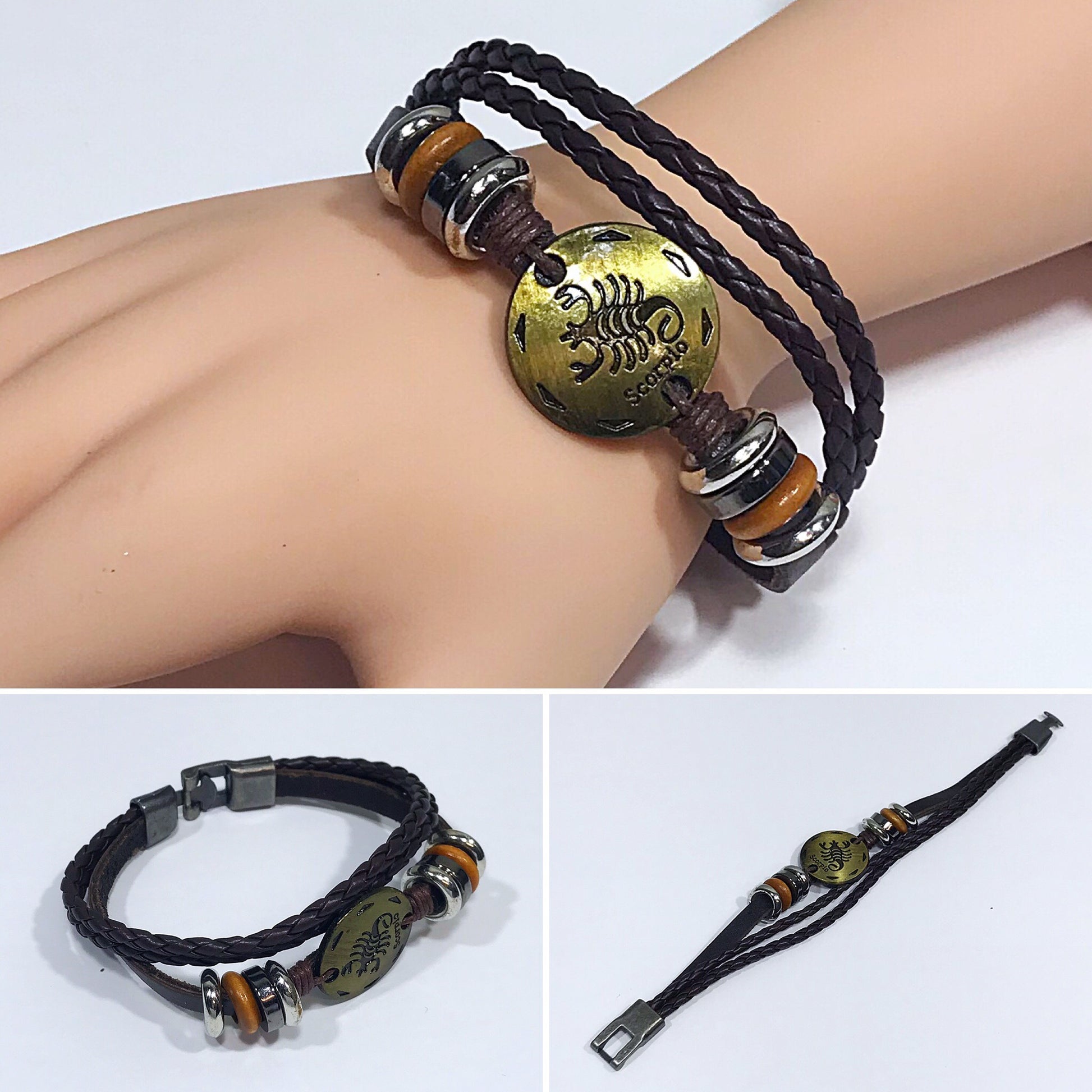 Brown Leatherette Antique Gold Finish Round Multilayered Zodiac Bracelet